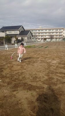 ひろばと農園を自由に行き来し、やりたい事をやって過ごす子ども達。ひろばでは戦いごっこ!?もはじまりぶーちゃんがみんなからの攻撃を頑張って交わします。