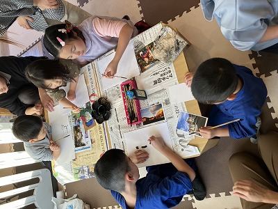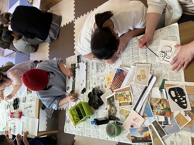 初めて墨をつかって絵を描くという子もいましたがお母さん達見守りのもとみんなそれぞれの個性がでた作品が出来上がっていました。
