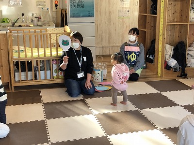 15日は「リズム遊びとふれあい遊び」ということで病後児保育室 ミルクの保育士さんにきていただきました。ペープサートからはじまりお母さんと一緒に行うふれあい遊びなど内容盛りだくさんでした。