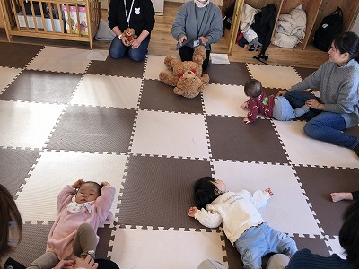 「だるまさんが♪」「びろ~ん」お母さん達はお子さんを高くあげて腕の運動になっていました。お子さんの楽しそうな笑顔がたくさん見れましたよ☆