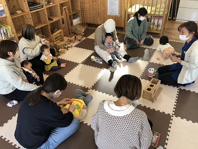 さて12月のひろばは2日にベビーマッサージを行いました。2ヶ月から11ヶ月の子の参加がありました。途中泣いてしまったりぐずってしまった時はお母さんに抱っこされ落ち着いたらマッサージをするなどお子さんのペースに合わせてゆっくりと。