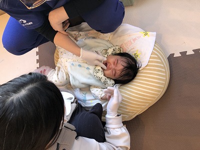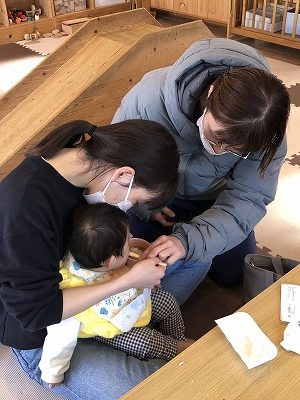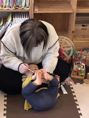 まだ歯が生えてきていない子はお口の中のマッサージの仕方を教えてもらっていました。