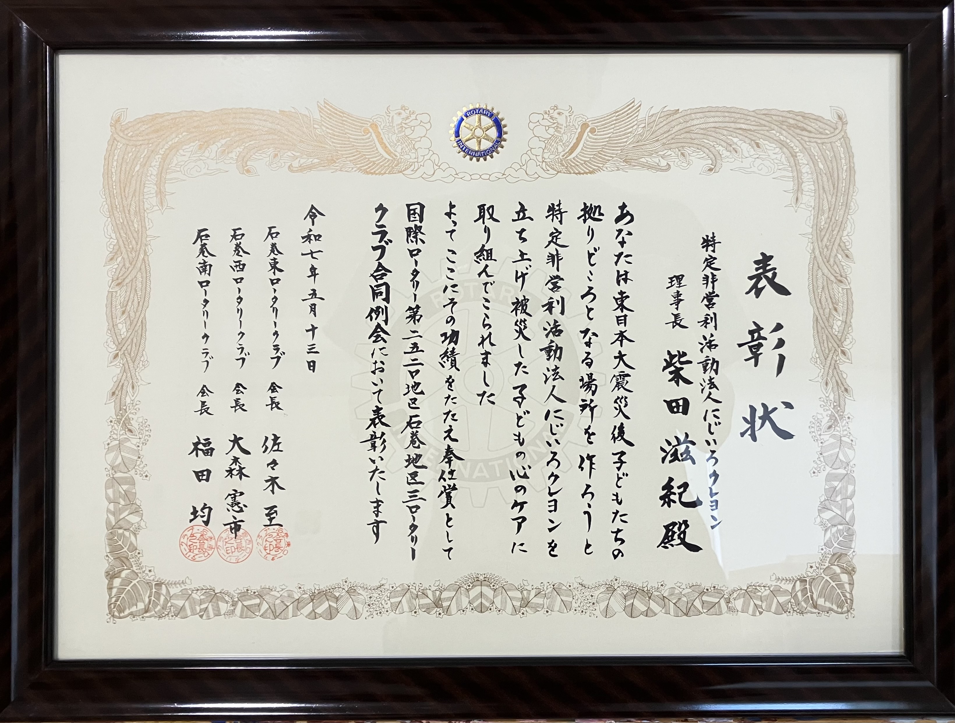 被災地石巻で子どもたちの支援活動を続けてきたことに対し、評価していただいたそうです。
