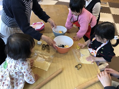26日は「親子でクッキング~クッキー作り」こちらはすぐに予約が埋まってしまい午前と午後の2回開催することに。生地はこちらで準備しお母さんと子どもで型抜きを。